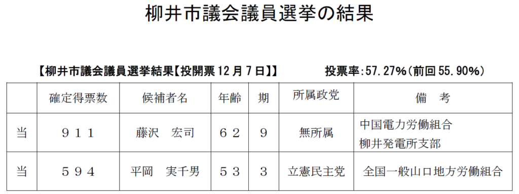 柳井市議会議員選挙については、12月7日に投開票され、おかげをもちまして、連合山口が推薦した「藤沢 宏司」候補、「平岡 実千男」候補は、見事当選を果たされました。 今選挙における今日までの日夜を問わぬ皆様の多大なるご尽力とご奮闘に対し、心より感謝いたします。