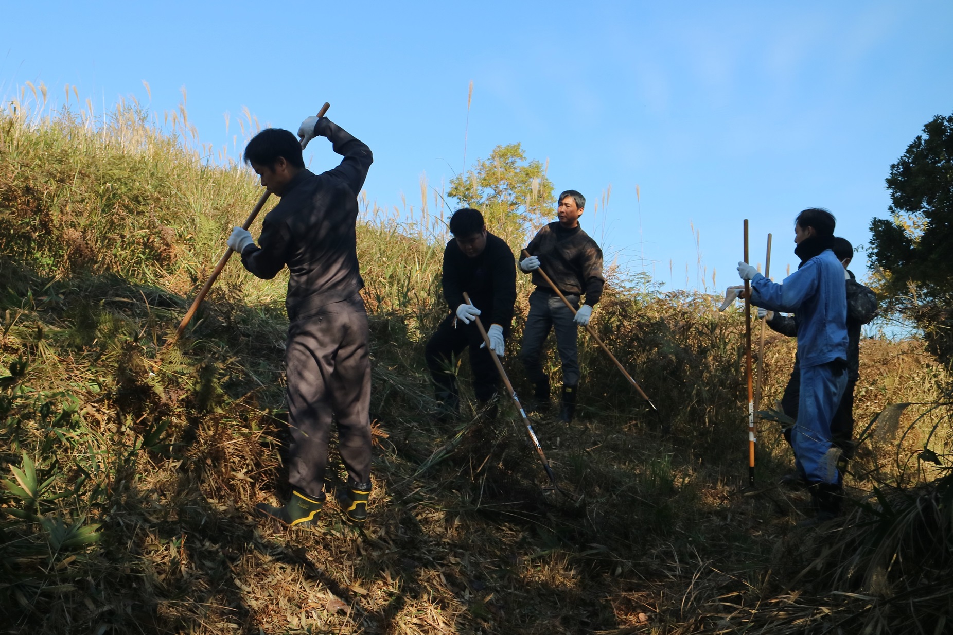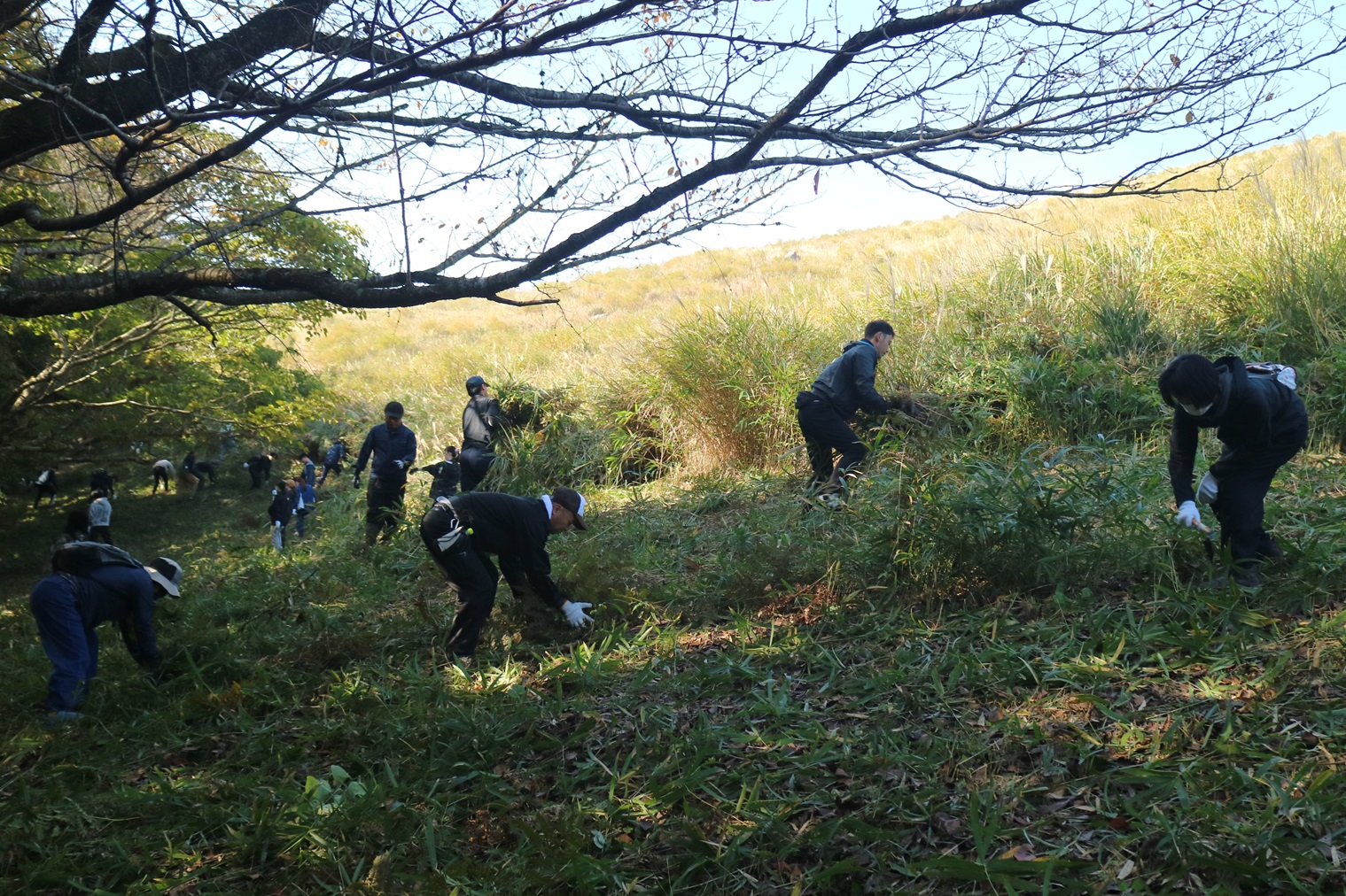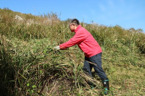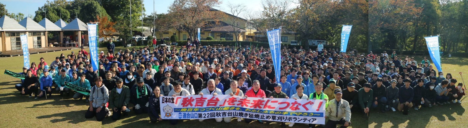 連合山口は、11月8日(土)「第22回秋吉台山焼き延焼止め草刈りボランティア」を実施し、組合員とご家族、退職者連合、組織内議員など、県内各地から約680名にご参加いただきました。はじめに連合山口中元会長の激励の挨拶と、篠田美祢市長からの感謝の言葉を受けました。今年2月に行われた山焼きは、天候不良によりほぼ全域が燃え残ってしまいましたが、草刈り当日は晴天に恵まれ、参加者は汗を流しながら例年より多くの草を刈り、6m×3㎞に及ぶ防火帯を作りあげました。
